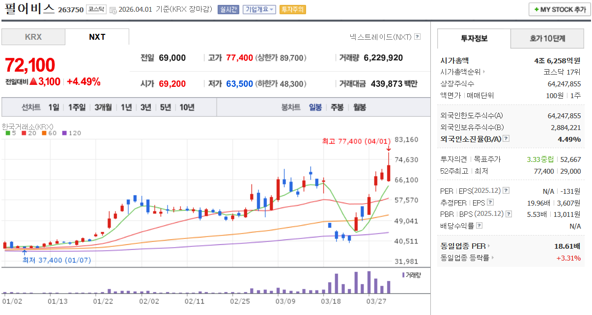 어쨌든 그래서 지금은 펄비 주가도 구경하는 중이랍니다. 물론, 매수를 할 생각은 없습니다. 10년 가까이 알고 지낸 회사고, 게임이 잘 나온것도 알겠고, 떨어져도 안심할 수 있는 상황인것도 알지만 진입하기에는 늦었거든요. 들어간 자리가 잘못되면 정말 심리적으로 힘들거든요.