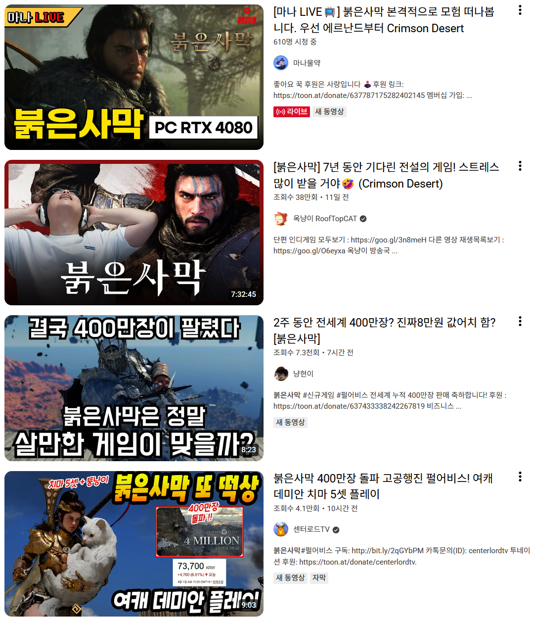 출시 초기에 불편한 조작감, 빈약한 스토리, 불쾌한 UI로 평가 점수를 낮게 받아서 하한가까지 갔던 펄어비스 붉은사막, 패치와 초기 판매량이 예상을 웃돌면서 평가가 반전되고 있죠. 그러면서 기술적 반등이 아닌 V자 반등으로 전고점을 뚫고 올라간 주가까지. 모두가 행복한 회사가 아닐까 싶습니다. 조회수도 잘 터지고, 관심도 높아서 유튜브에서 영상들이 많이 나오네요. 물론, 저는 하나도 안 봤습니다.