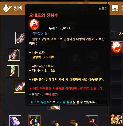 오네트의 정령수(HP), 오도어의 정령수(MP) 두 개의 무한물약은 시작 퀘스트가 없습니다. 재료 아이템 3개를 모으는게 먼저입니다. 제 경우에는 이벤트 기간에 대부분 장만해서 비교적 쉽게 모을 수 있었습니다.