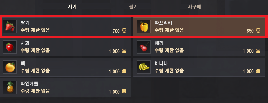 ▲ 밀라누 델루치에게서는 딸기와 파프리카를 사서 쓰시면 됩니다. 요리에서 채소와 과일은 모두 호환이 되기 때문에 파프리카 한 가지만 있으면 다 만들 수 있습니다.